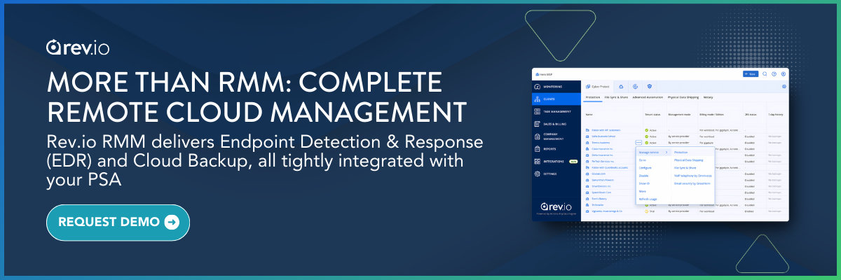 Pro tip: If you're already running Rev.io PSA, this gets even simpler. Rev.io RMM (powered by Acronis) adds AI-driven monitoring, EDR, and cloud backup directly inside your existing PSA. Alerts create tickets automatically with SLA context attached.
