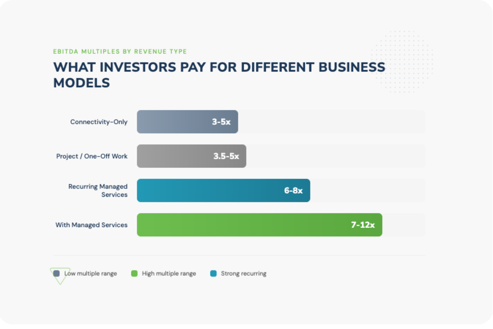 Recurring managed services trade at 6-8x EBITDA versus 3.5-5x for project-heavy revenue. The reason is straightforward: investors can forecast cash flow when revenue recurs monthly. When they know what next month looks like, the business is less risky to own — and less risky means a higher price.