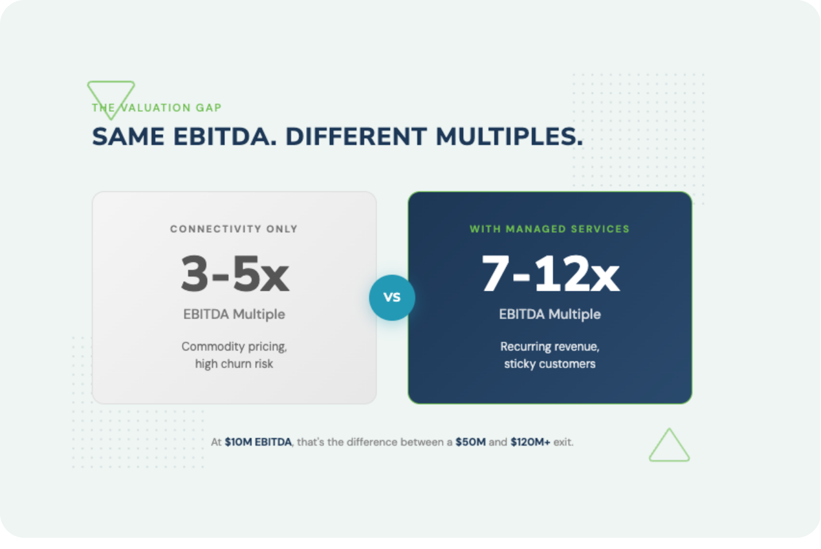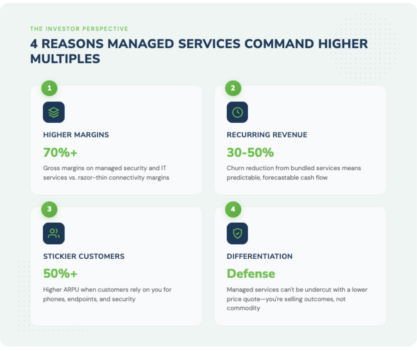 When an investor looks at a CSP selling managed security, SD-WAN management, and UCaaS monitoring alongside connectivity, they see a business that's hard to replicate. Competitors can't just undercut your price and steal the account. That kind of defensibility is what drives multiples up.