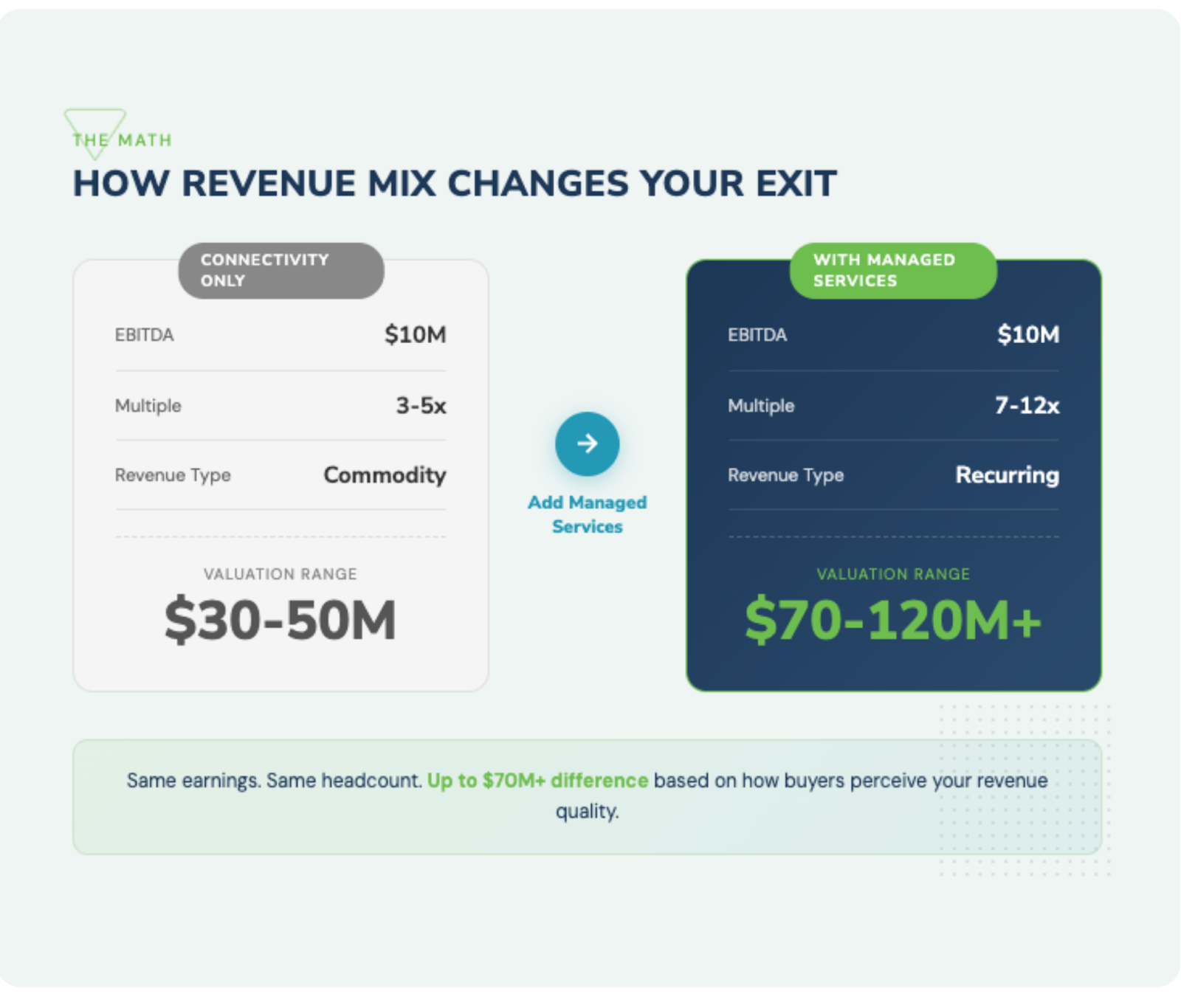 You also don't need to flip a switch and become an MSP tomorrow. Even moving 20-40% of gross profit into managed services means that portion gets valued at the higher recurring multiple instead of the lower connectivity multiple. Every dollar you shift is worth 2-3x more to a buyer. The changes compound over time.