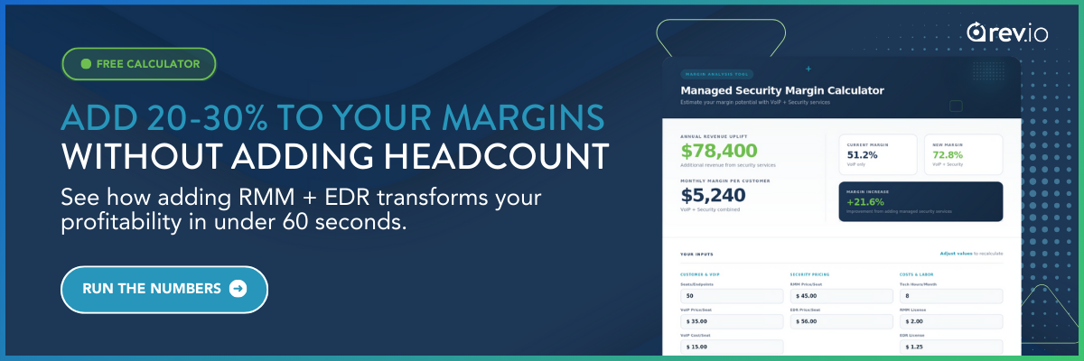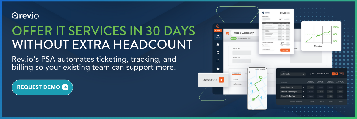At minimum: RMM, EDR, and a PSA platform that handles billing across multiple service types. The key is integration between those tools so you're not creating manual work that erodes the margins you're trying to build. Rev.io connects service delivery with billing automation so everything runs through one system.