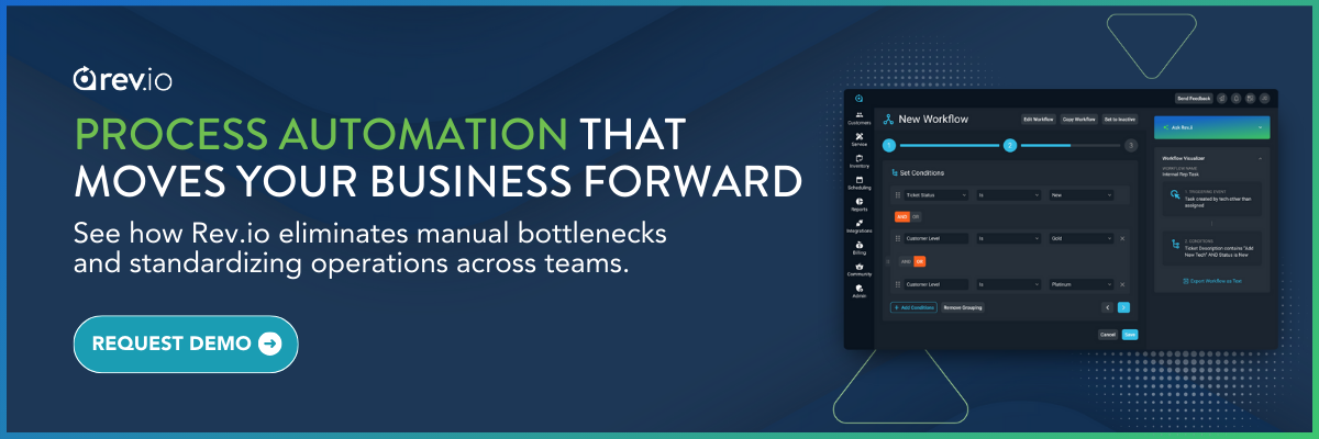This saves 5-10 minutes per tech per day on status housekeeping and gives you accurate data on ticket aging and resolution times. Rev.io's workflow rules let you set these conditions without coding. Define the trigger, define the action, and the system handles it from there.