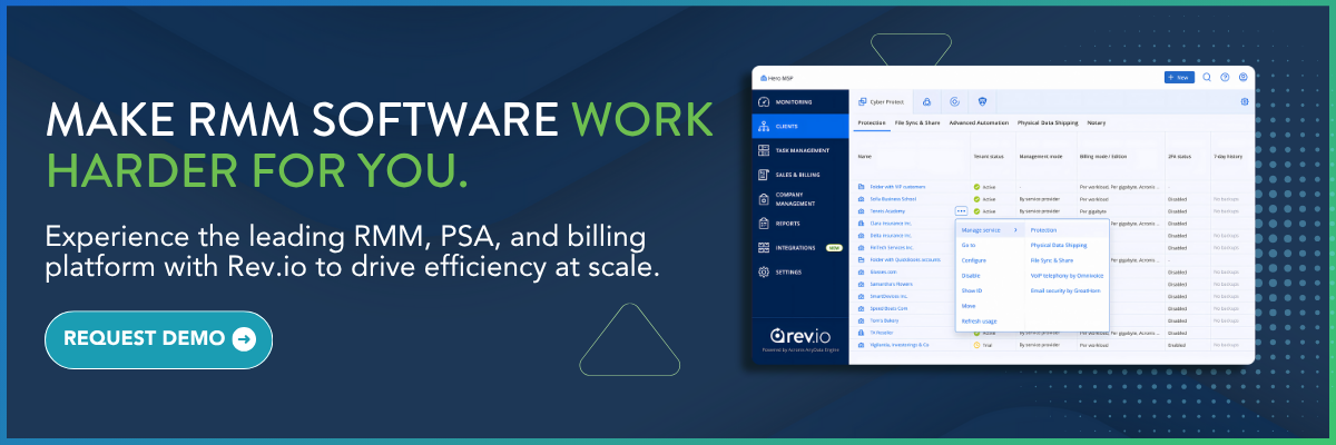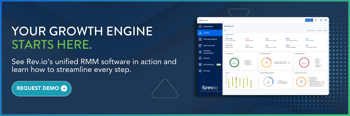 If you’re ready to grow smarter, not harder, it’s time to see what a unified platform can do for your business. Explore how Rev.io’s RMM software, integrated seamlessly with our PSA and billing solutions, helps you cut complexity, increase margins, and deliver the service your clients expect every time.